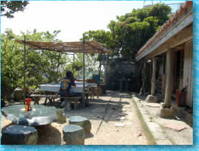 ガイドブックをチェックして、昼ご飯の場所を物色。首里城からそれほど遠くないところの沖縄ソバ屋が外に席アリ。道に迷いながら(ちょっとわかりずらい場所にある)たどり着いて訪ねると、外なら問題なしで犬OK。古い沖縄の民家を使っていて雰囲気も良いし、ソバも美味。それ以上に冷やしぜんざいが大当たりで、嬉しかったな。 |
